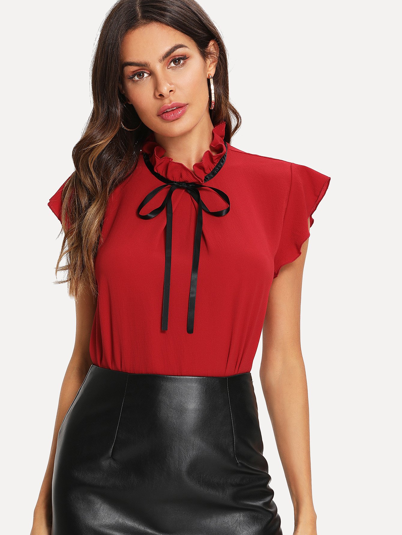 | Blouse à col plissé rouge, SheIn - Body manches en dentelles noir, She In |